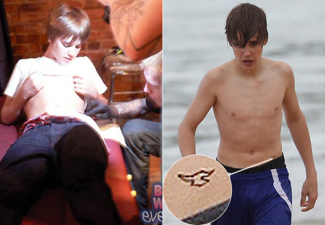 Justin Bieber seguiu uma tradição familiar e tatuou um pequeno pássaro na região do quadril. O desenho já havia sido revelado no mês passado enquanto o jovem cantor aproveitava a tarde livre em uma praia da Austrália. Agora, o site "Daily Fill" divulgou uma foto do fenômeno pop, de apenas 16 anos, no estúdio de tatuagem Gun, em Toronto, no Canadá, onde ele fez o desenho.