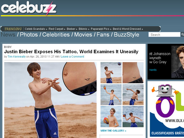 O site "Celebuzz" também revelou na segunda-feira, 26, uma detalhe sobre a vida de Justin Bieber que poucos conheciam: ele tem uma tatuagem! O fenômeno pop, de 16 anos, foi fotografado sem camisa em uma praia da Austrália no último sábado, 14, deixando à mostra um pequeno desenho do contorno de um pássaro que tem na barriga.